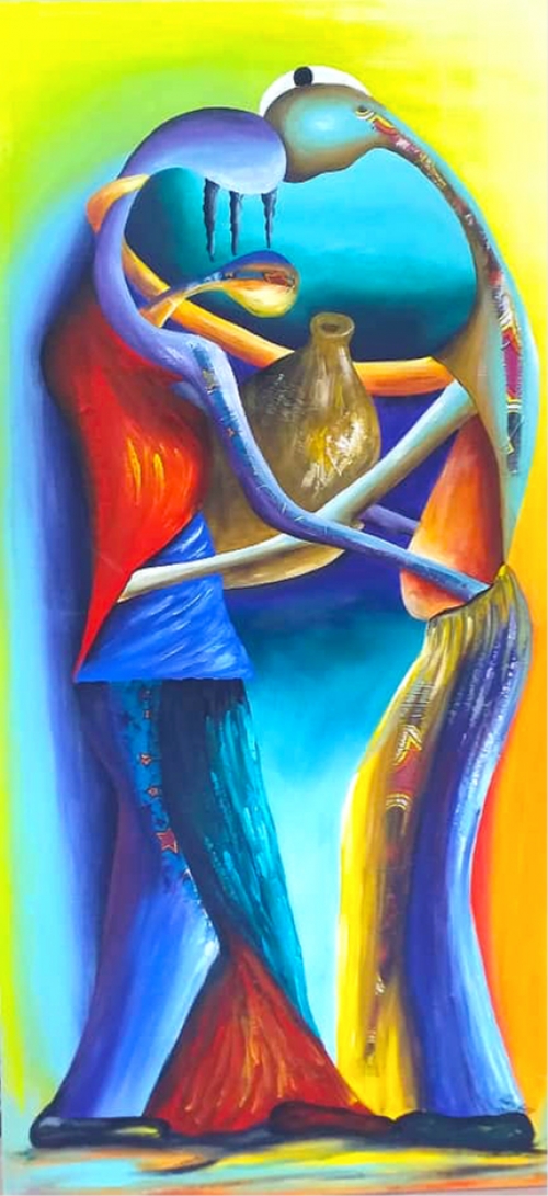 Il y a du Giacometti et du Picasso dans le travail d’Abdou Fall. Il en partage les corps filiformes en mouvement et les corps à la plastique déformée. Bien plus moderne que contemporain, Abdou Fall parcourt différents thèmes : la vie, la mort, la maternité, l’environnement. Il assigne à chacun une identité visuelle forte avec des coloris choisis à bon escient. Il les révèle tous au détour d’un réalisme aux tendances cubistes.