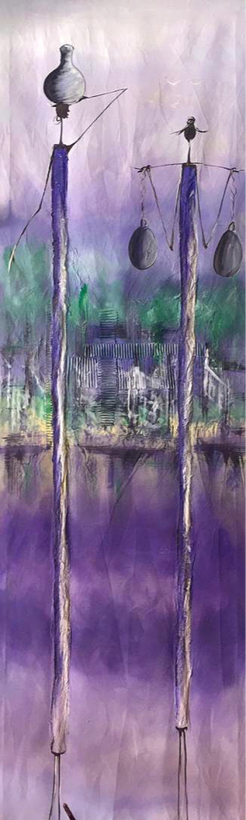 Porte de non retour, Monde debout et Vendeuses de lait font apparaître des corps que seule la géométrie dessine, des rectangles sombres et sobres, des ombres silencieuses qui s’acheminent vers leur mission, si ce n’est leur destin. Ces corps en mouvement ont quelque chose de sculptural qui les porte au delà de leur simple figuration, au seuil d’un chemin qui semble s’ouvrir à eux. L’acrylique des fonds, sa densité, où des couleurs s’entremêlent en modelés tournoyants, participe d’un rendu vertigineux.