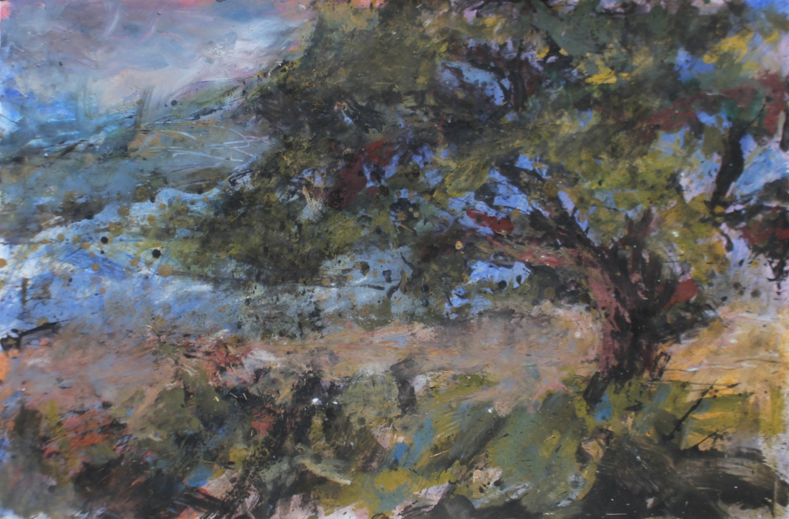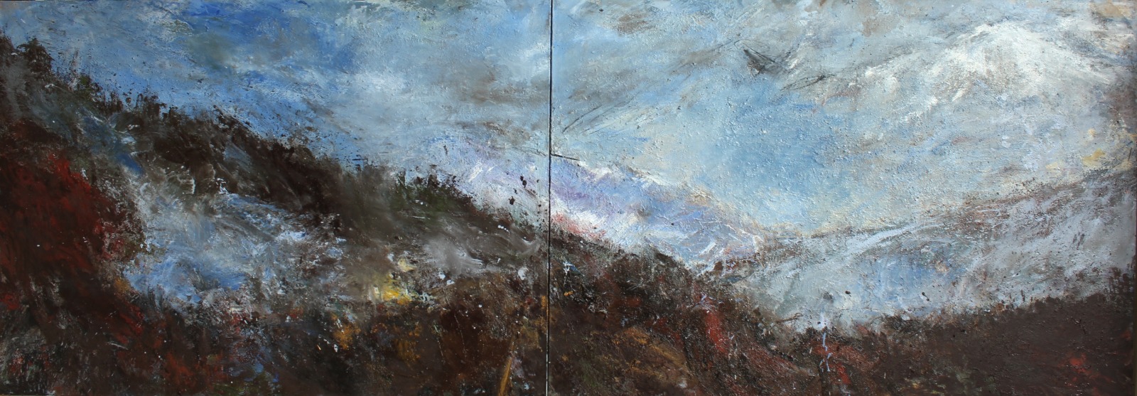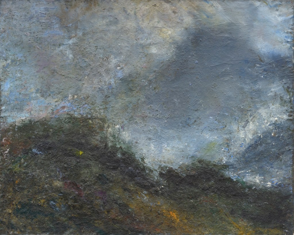 Il y a dans la peinture de Vincent Bebert, un mélange de substances à forte densité et cela fait de sa matière picturale, une masse pleine et profonde qui touche le regard. Oui qui touche le regard, au sens premier du terme, puisqu’elle donne aux pièces un côté matiériste, à ceci près qu’il n’y a pas que de l’expressionnisme abstrait dans ce travail. L’expression de Bebert prend racine dans la nature et à plus forte raison dans les paysages. Nature et expression sont synchrones chez ce peintre qui ne prend possession du corps de la nature qu’en l’étreignant, qu’en expérimentant par lui-même ses forces et ses mouvements, là au milieu d’elle, à travers champs, qu’en transposant ses ressources sur ses toiles, par cette pluie, entre autres éléments, qui travaille la consistance du rendu pictural.