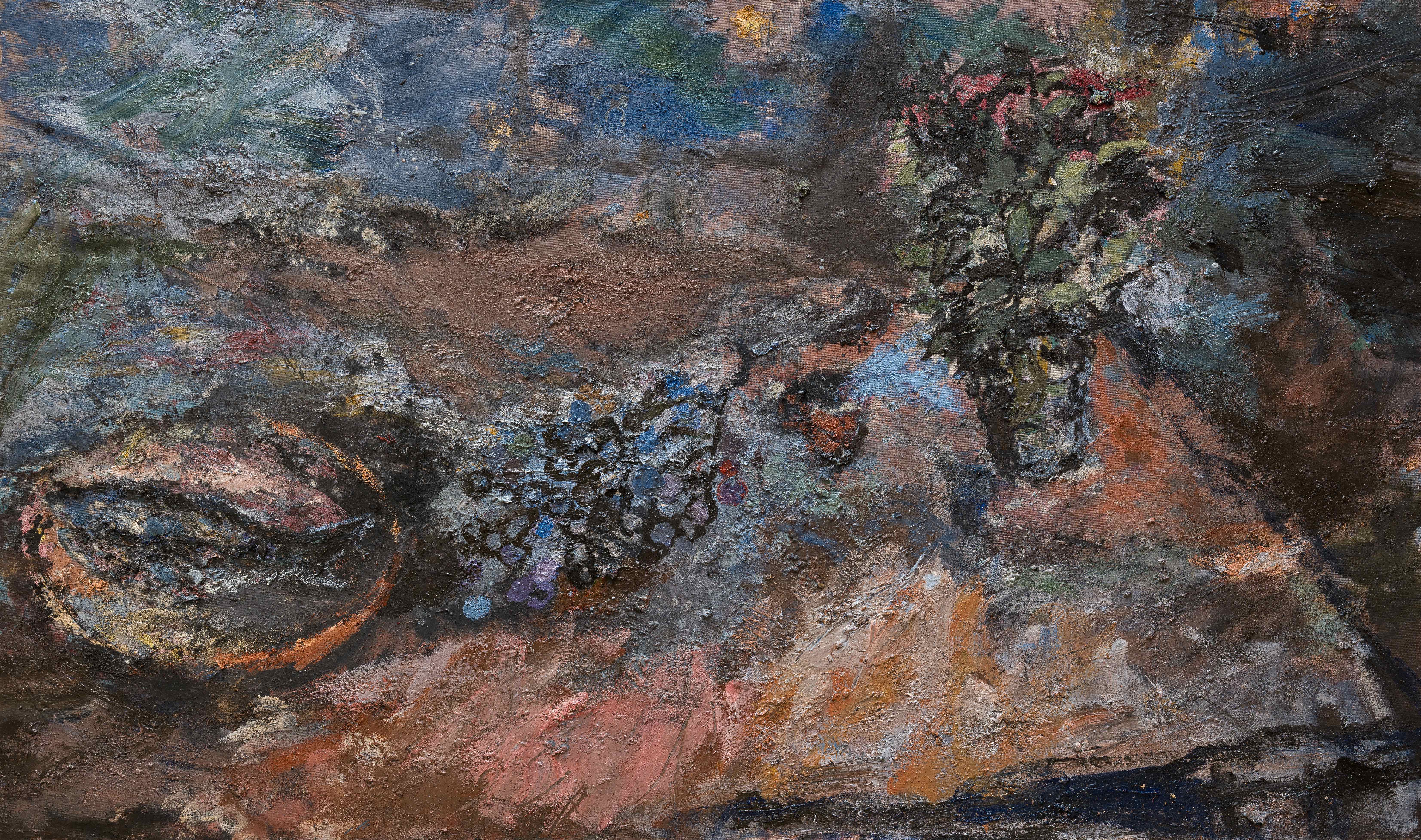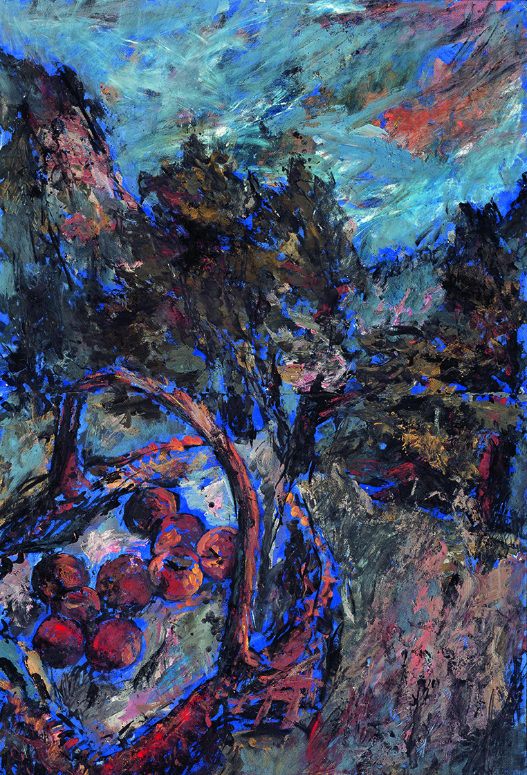 Il n’y avait donc qu’un pas vers des tableaux plus figuratifs avec des formes particulières, des arbres, surtout des arbres, mais aussi des paniers de fruit et des bouquets de fleurs. Tout peintre paysagiste qu’il est, Vincent les situe toujours sur une pâte dense et lumineuse en fond, comme les ciels du Titien ou d’Odilon Redon. Le trait a donc fait son apparition et devance parfois la couleur.