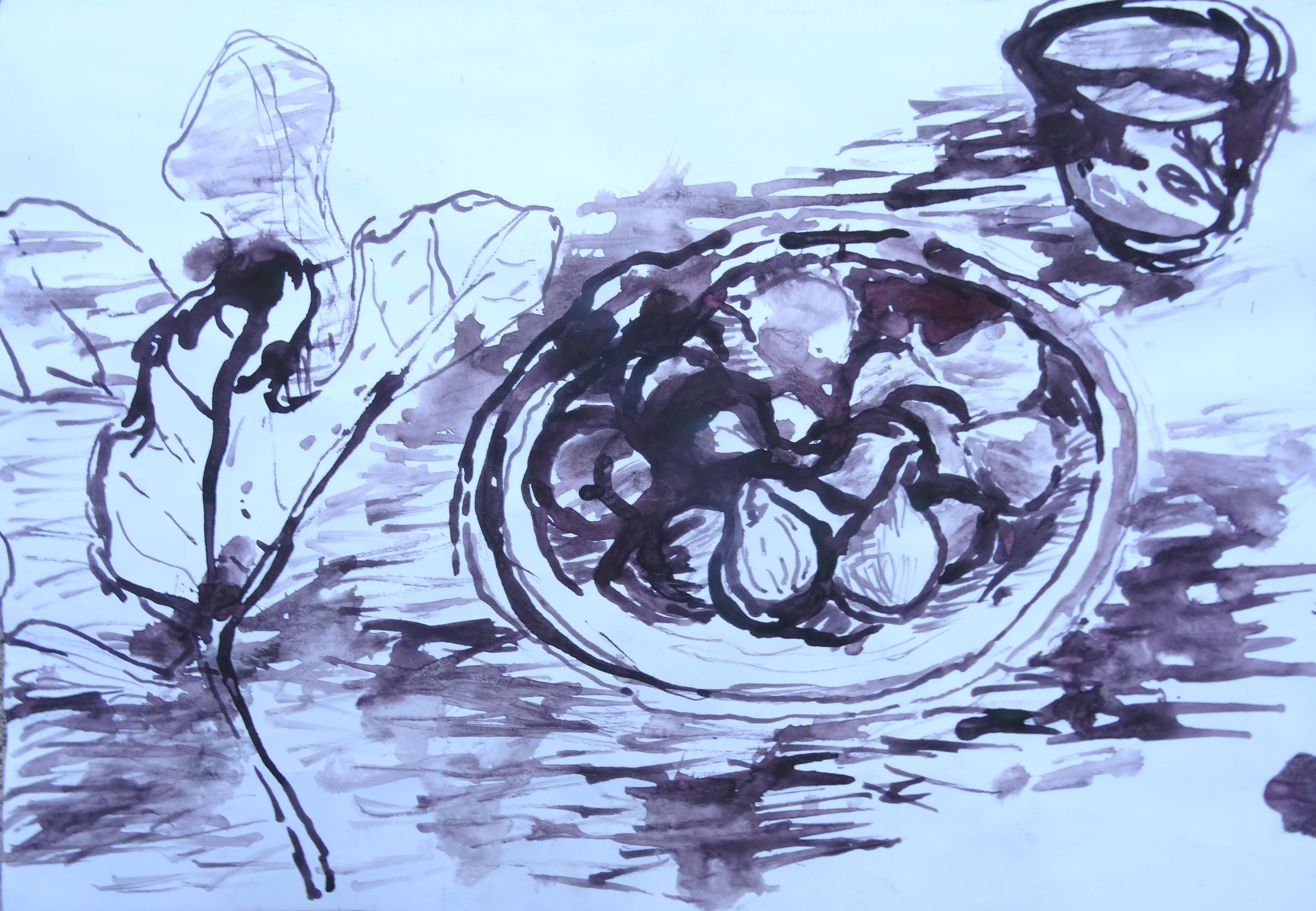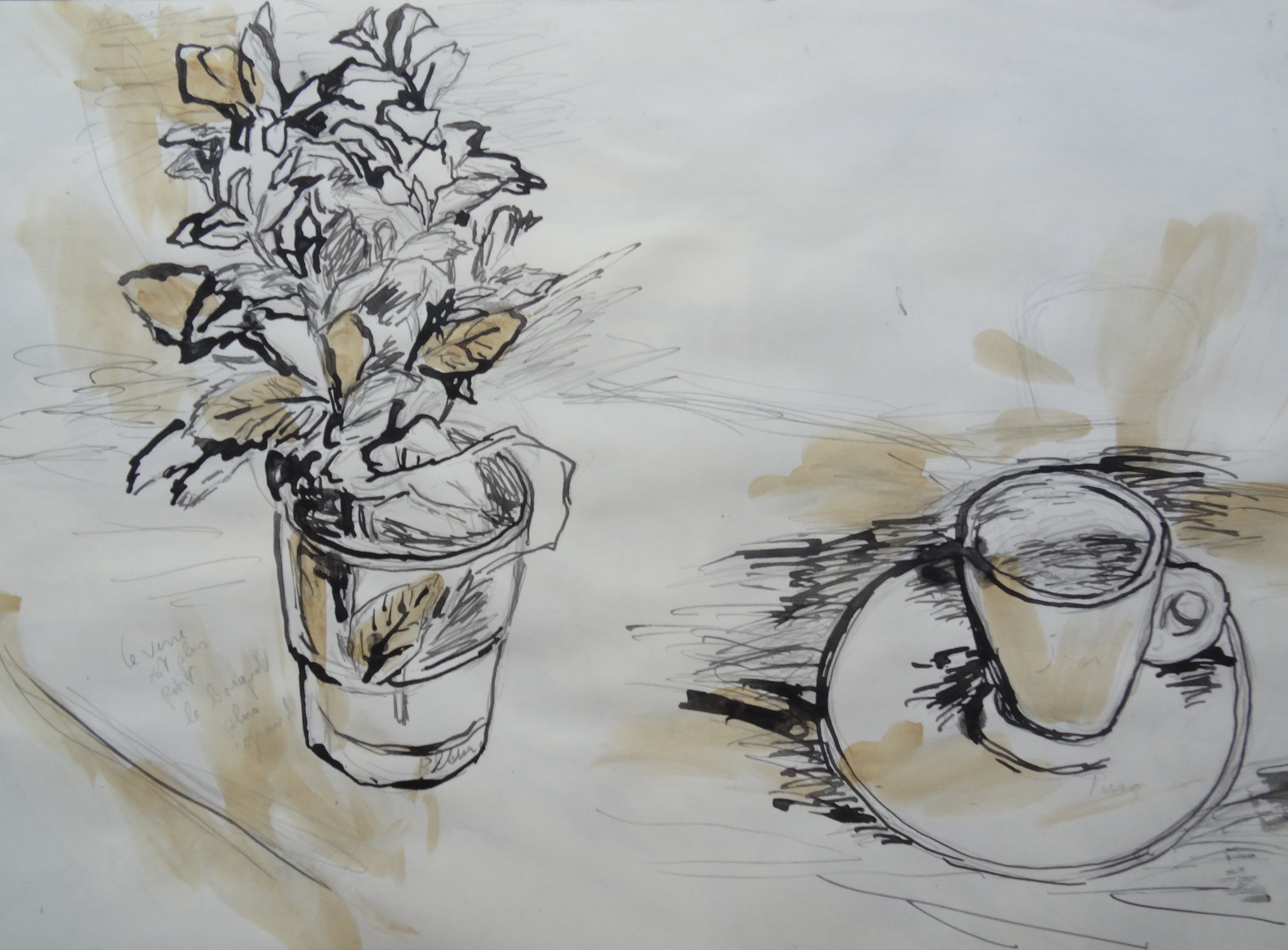 Depuis tant d’années que je contemple le travail de Vincent Bebert, j’ai comme l’impression qu’il zoome de plus en plus sur des objets du quotidien, théière, verre, tasse de café, coupe de fruit et pot de cornichons, au point d’en faire les seuls modèles de ses tableaux, des vies silencieuses qui se suffisent désormais à elles-mêmes. C’est assez surprenant pour moi qui avais l’habitude d’embrasser du regard des immensités. Est-ce que ce peintre se renouvelle ou est-ce qu’il dévoile des trésors cachés ?