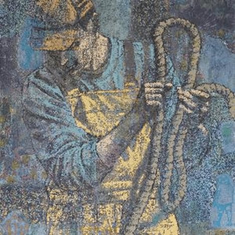 A l’aune de ce qui la toucha un jour dans une attitude, au détour d’une plage ou d’un village de pêcheurs, Virginie Delmas travaille de grandes pièces en atelier, retranscrivant ce qui l’a piqué sur le vif. Il y a quelque chose de l’école de Wissant dans son travail, si ce n’est que son regard zoome sur un ciré ou un panier de poissons, plutôt qu’il ne s’empare de tout le paysage de la scène. Pas d’adieu donc de femmes de pêcheurs, tenant dans leurs bras leur progéniture et observant éplorées le flobart de leur mari prendre le large, mais des natures mortes qui parlent à leur manière de la même histoire. On retrouve ce chromatisme contrasté qui rend à lui-seul et avec un réalisme sans faille les plis des vêtements et la consistance des éléments, dans cette même lumière crépusculaire qui témoigne du labeur achevé. Un thème certes plus moderne dans la démarche d’un surfeur qui porte sa planche, mais où l’on retrouve la même détermination, le fatalisme en moins, à dompter la vague, si ce n’est la houle.