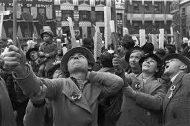 La photo source d’émotions s’éloigne et fait place à la photo source d’information. Chaque épreuve du Leica (l’outil de travail de HCB) résulte d’une stratégie qui nous reconduit au réel. Le cadrage, la composition et la lumière percent le mystère de l’évènement. Cela s’illustre en particulier dans la photographie des foules, ces rassemblements populaires qui sont en eux-mêmes les « Icônes du Pouvoir ». HCB se demande toujours sous quel angle les choses se donnent le mieux à voir. C’est sous l’angle de la foule que les régimes totalitaires et la société de consommation se révèlent le mieux. La disposition des individus rassemblés en une foule opaque, ce cadrage géométrique en lequel aucun pas de côté n’est possible ni même envisageable, est ce qui illustre au plus près leur essence.