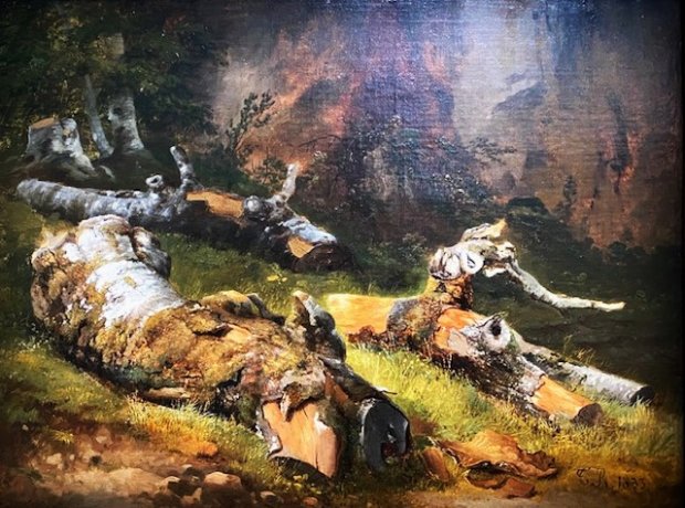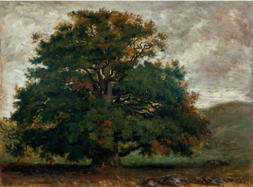 Il y a chez Théodore Rousseau une figuration de la forêt depuis l’intérieur. Oui, avec ce peintre, nous sommes immergés dans les bois, les pieds sur terre, comme on dit, et le regard aux abords des marres, à tel point que nous pourrions entendre les grenouilles coasser. Nous faisons corps avec le feuillage et si nous apercevons le ciel, alors c’est en ellipse, un cercle de lumière au dessus de nos têtes, un écran circulaire qui nous survole, une jolie manière de nous remettre à notre place dans la nature, nous qui n’en sommes pas maître et possesseur, mais bien plutôt partie intégrante autant que membre constitutif. Cette ode à la nature qui rompt avec le paysage idéal de Nicolas Poussin ou les champs historiques de Jean-Charles Rémond, nous le rappelle avec force et panthéisme. Rousseau, un peintre qui sait rendre le paysage dans sa plus pure naturalité en travaillant sur le rendu des matières de la forêt. Oui, celui-ci sera flouté, dilué, empâté, hachuré et suivant un savant mélange de médiums (aquarelle, gouache, pastel), la texture saura rendre l’aspect dense et terreux de ces paysages saisis directement sur le motif. S’il faut aussi retenir l’arbre comme un motif paysager essentiel dans ce travail, puisqu’en effet les portraits d’arbre y ont une place majeure, comme chez Alexandre Hollan, il n’en demeure pas moins que les études de branche ou d’écorce, participent du lyrisme et de l’expressivité de cette œuvre qui met un point d’honneur à représenter le réel dans ce qu’il a de plus singulier, ces parties un peu atomistiques qui, par effet cumulé, créent le tout de la nature et sa profondeur abyssale.